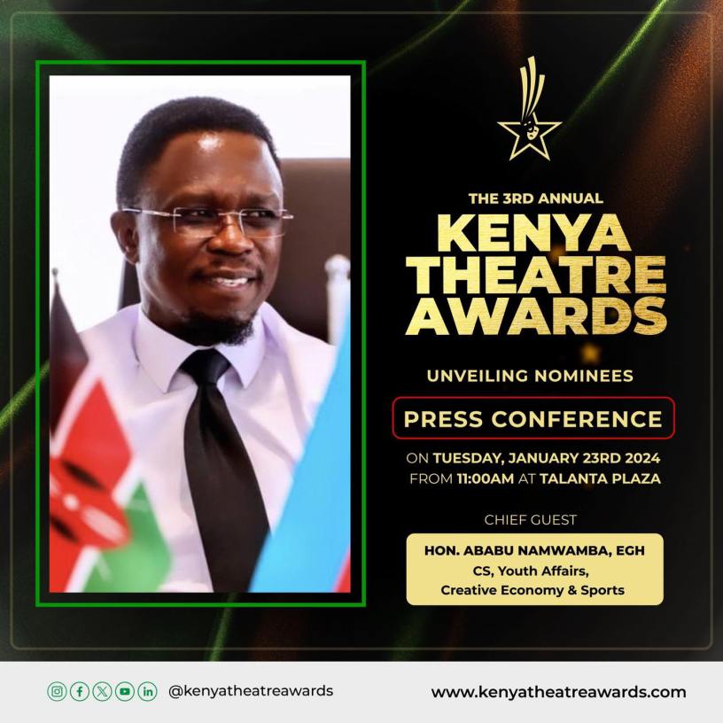 The unveiling of the 35 eligible categories open for public voting will be conducted by the Kenya Theatre Awards Secretariat on Tuesday, January 23, 2024, 11:00 am at the Talanta Plaza, hosted by the Ministry of Youth Affairs, Creative Economy & Sports, with CS, Hon. Ababu Namwamba, EGH as the Chief Guest. The highly anticipated event will equally be live-streamed for wider accessibility.