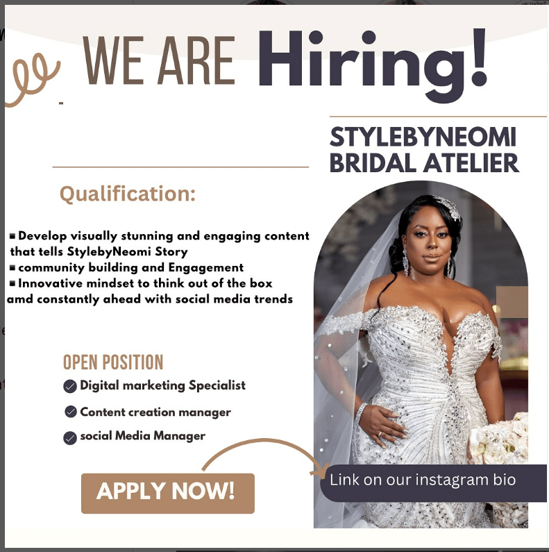 Style by Neomi is a Luxury wedding dress and gowns fashion house based in Nairobi. The fashion shop has advertised three positions all related to digital marketing for a digital marketing Specialist, Content Creation Manager and a Social Media Manager.